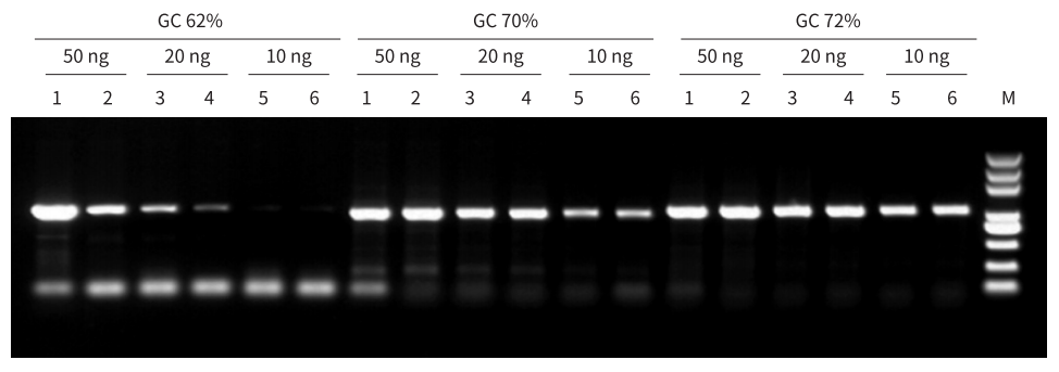 以小鼠 gDNA(50 ng、20 ng、10 ng)為模板,使用 A008 擴增不同 GC 含量的目的片段。結(jié)果顯示,A008 對高 GC 含量的片段擴增能力強