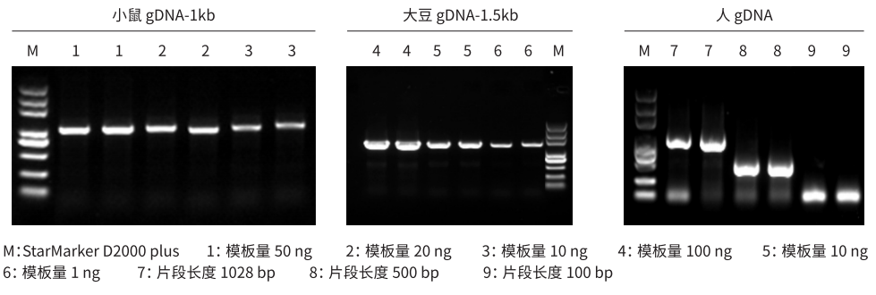 以小鼠 gDNA(50 ng、20 ng、10 ng)大豆 gDNA(100 ng、10 ng、1 ng)和人 gDNA(50 ng)為模板,使用 A008 擴增進行擴增。結(jié)果顯示,A008 對動物、植物等不同來源模板擴增性能表現(xiàn)優(yōu)異