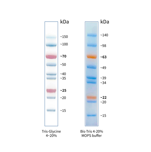 本產(chǎn)品由跨度從 15-150 kDa 的 9 種高度純化的橙色、藍(lán)色預(yù)染蛋白質(zhì)組成。其中 25 kDa 條帶和 70 kDa 條帶為橙紅色預(yù)染條帶。本產(chǎn)品適合作為 SDS-PAGE 電泳時(shí),變性蛋白樣品的分子量參照,并可實(shí)時(shí)觀察蛋白樣品的電泳分離狀況,也可用于檢測(cè) Western blot 的轉(zhuǎn)膜效率。由于共價(jià)結(jié)合的染料會(huì)影響蛋白質(zhì)分子的電泳遷移率,本產(chǎn)品僅適于粗略地估計(jì)目的蛋白樣品的分子量。