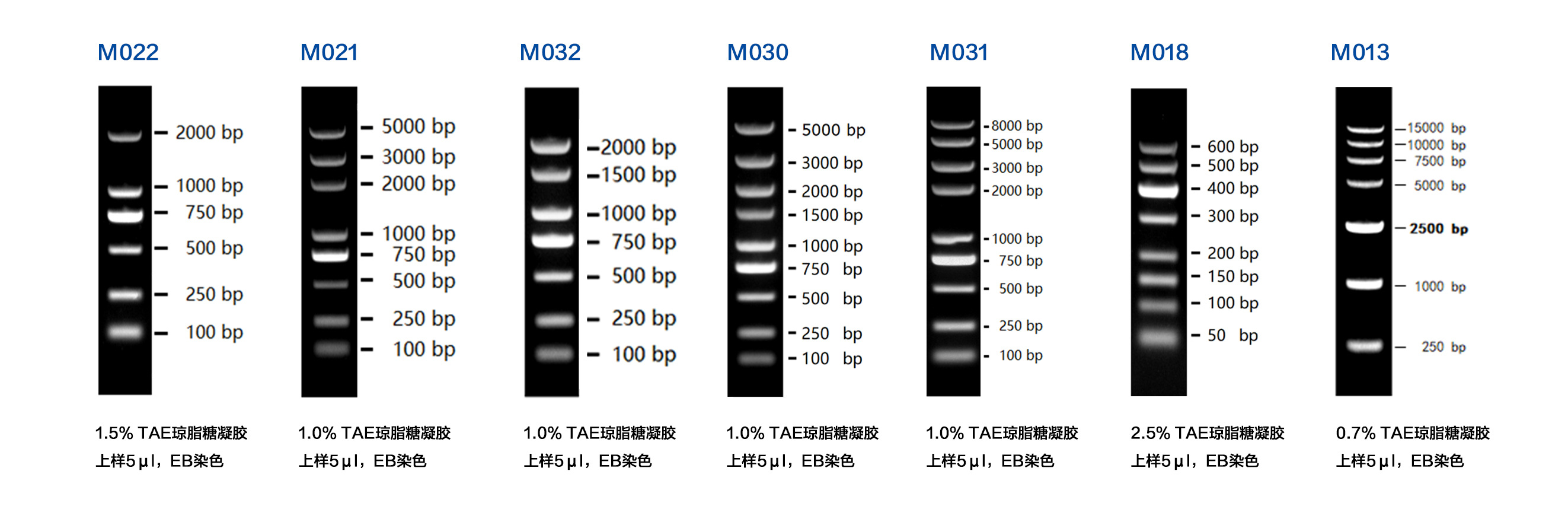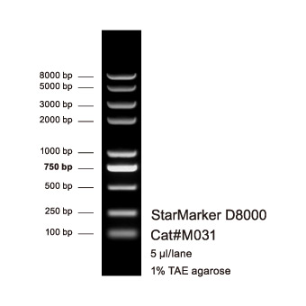 本產(chǎn)品為預混有 1× 上樣緩沖液的即用型 DNA 分子量標準,由 9 條線狀雙鏈 DNA 條帶組成,適用于對 100-8000 bp 的雙鏈 DNA 分子大小的估算和粗略定量。本產(chǎn)品的 9 條帶分別為 100、250、500、750、1000、2000、3000 和 5000 bp、8000 bp。其中 750 bp 條帶濃度最大,為 100 ng/5 µl,其余條帶濃度約為 50 ng/5 µl。