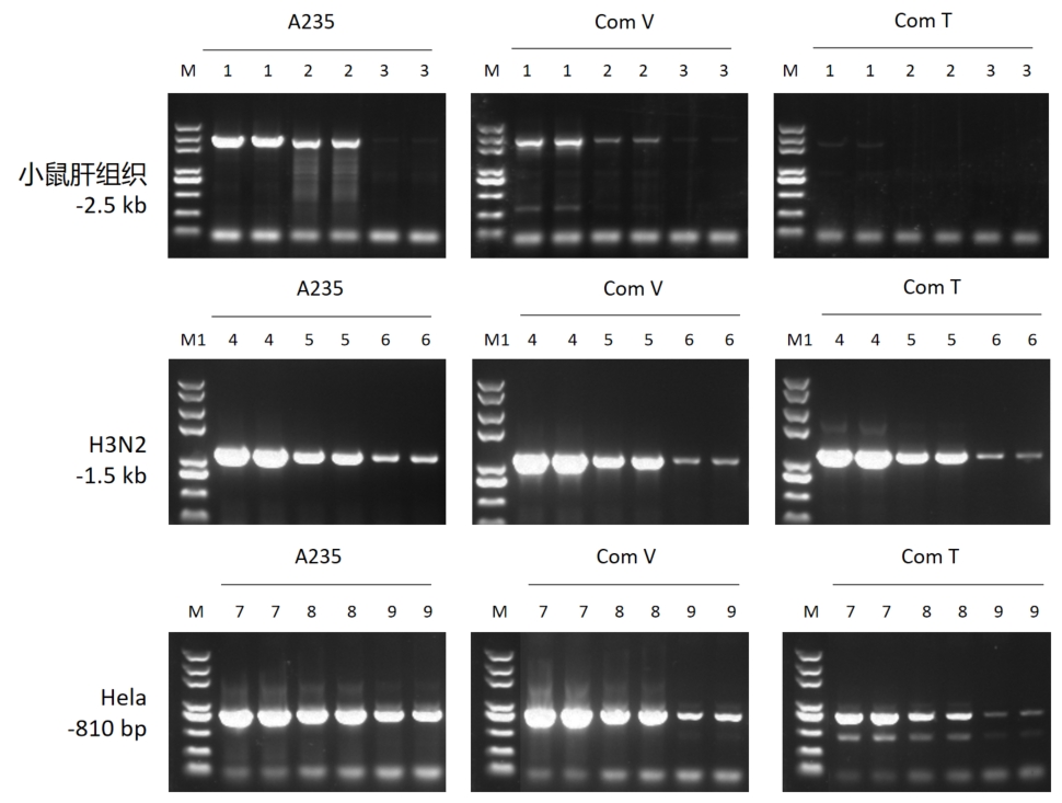 分別以小鼠 RNA (100 ng/10 ng/1 ng)、不同稀釋倍數(shù)的甲流(H3N2)RNA、Hela 細(xì)胞 RNA (10 ng/1 ng/100 pg)為模板,使用 A235 進(jìn)行反轉(zhuǎn)錄。結(jié)果顯示, A235 適用性極廣且擴(kuò)增效率高。