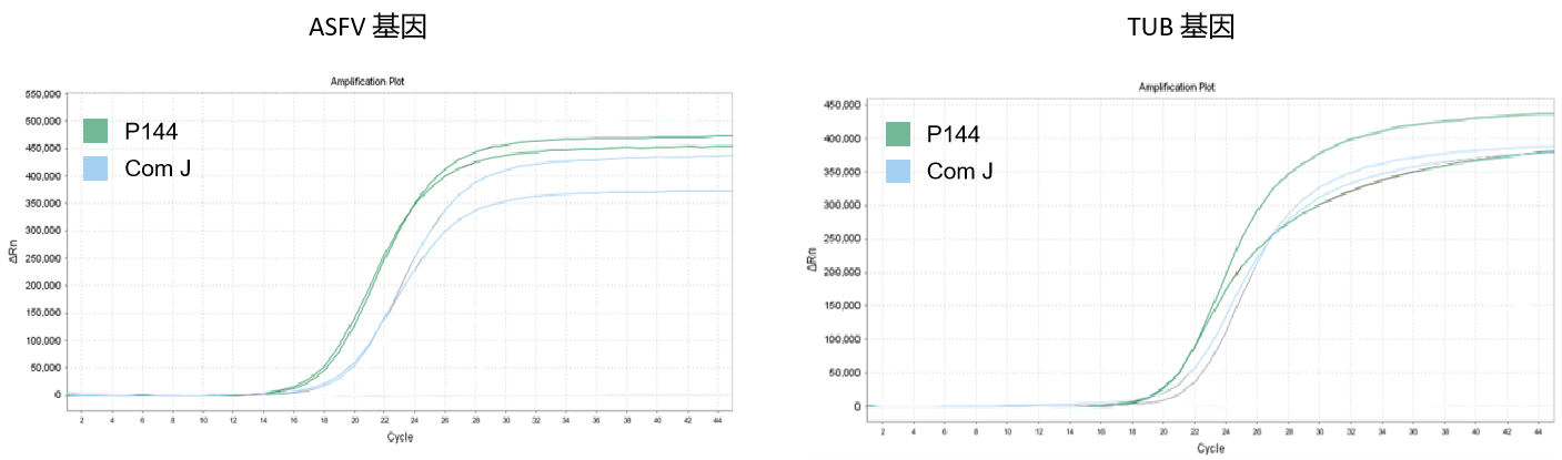 以 50 mg 含有非瘟病毒(ASFV)的豬肉組織為樣品,使用 GenStar #P144 和 Com J,室溫孵育 5 min 后進(jìn)行核酸提取,提取后進(jìn)行 qPCR 檢測。結(jié)果顯示,P144 提取效率高,且優(yōu)于 Com J。