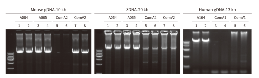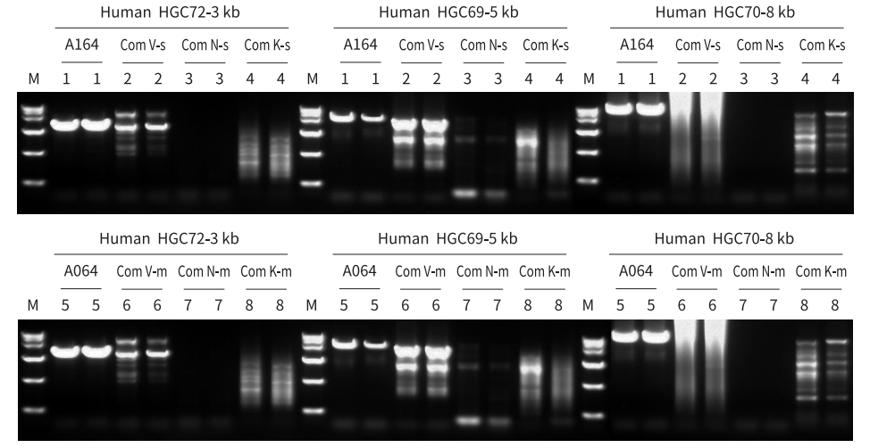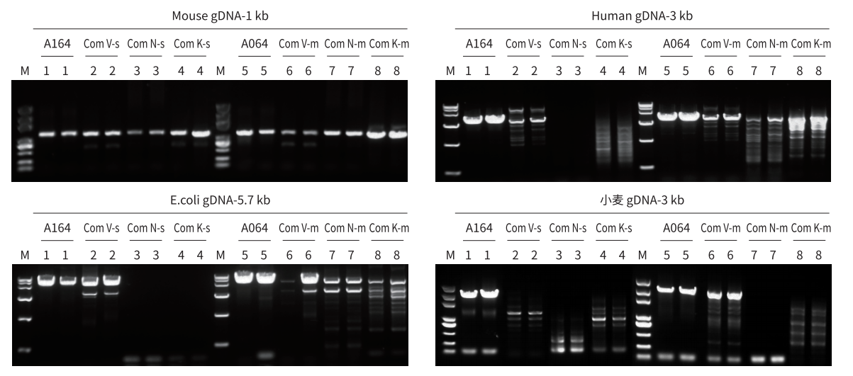 分別以人、小鼠、小麥、E.coli gDNA 為模板,使用 A064/A164、Com V、Com N、Com K 進(jìn)行不同長度片段擴(kuò)增。結(jié)果顯示,A064/A164 對(duì)不同種屬來源不同長度的 gDNA 片段兼容性強(qiáng),均能良好擴(kuò)增,且優(yōu)于 Com V、Com N 和 Com K