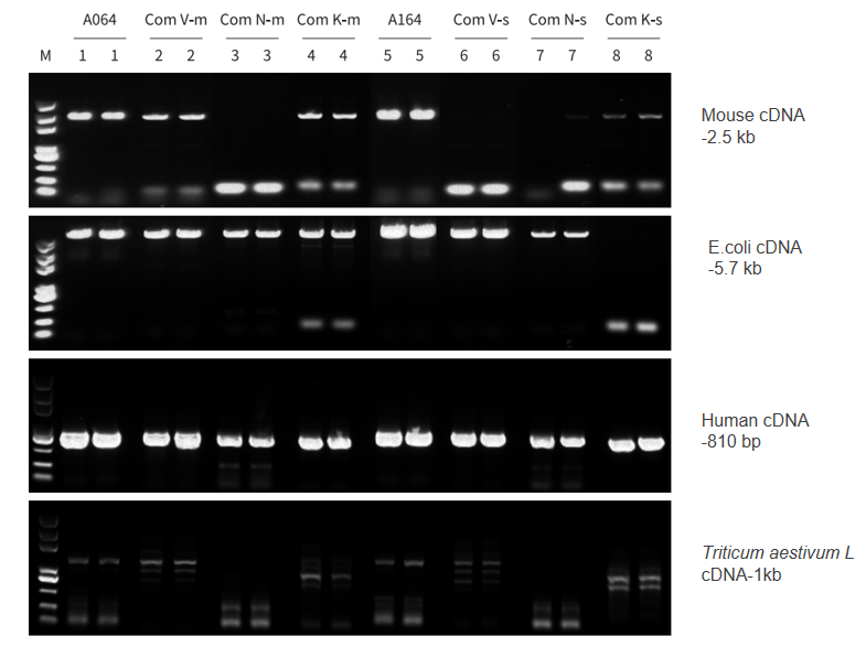 分別以人、小鼠、E.coli cDNA 為模板,使用 A064/A164、Com V、Com N、Com K 進(jìn)行不同長度片段擴(kuò)增。結(jié)果顯示,A064/A164 對(duì)不同種屬來源不同長度的 cDNA 片段兼容性強(qiáng),均能良好擴(kuò)增