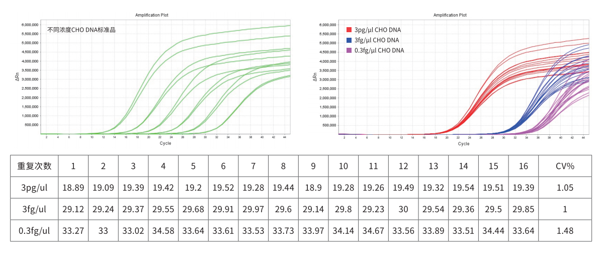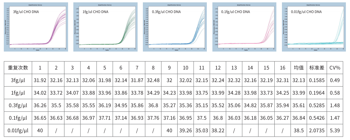 重復(fù) 16 次檢測(cè) 3 pg/μl、3 fg/μl 和 0.3 fg/μl 的CHO DNA,Ct 值 CV<5%,結(jié)果顯示 GenStar #A802 重復(fù)性好。