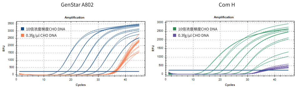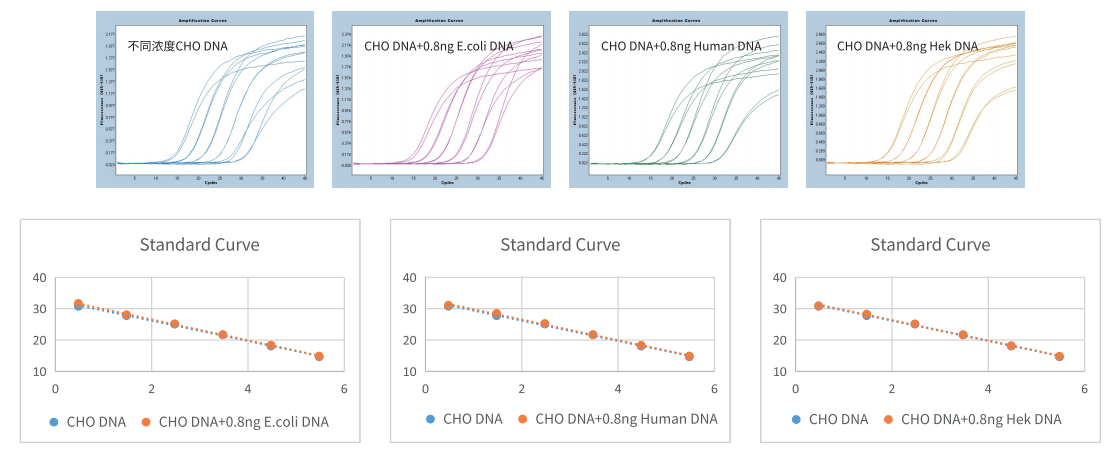 在不同濃度 CHO DNA 中分別加入 0.8 ng E.coli、Human、Hek 干擾 DNA,干擾組與對(duì)照組基本重合,未見(jiàn)干擾??梢?jiàn) GenStar #A802 特異性很強(qiáng),不同細(xì)胞系間無(wú)交叉反應(yīng),結(jié)果更準(zhǔn)確。