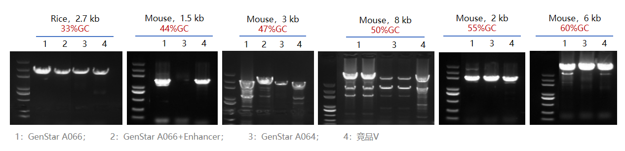 以 Mouse、Rice gDNA 為模板,使用 GenStar A066 和 GenStar A064、競品 V 分別擴(kuò)增不同 GC 含量的目標(biāo)片段。