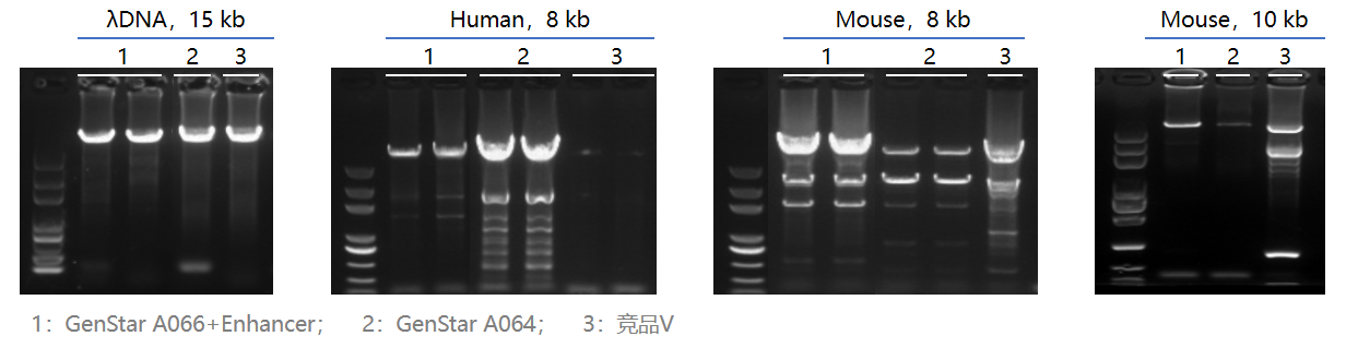 以 λDNA、Human gDNA、Mouse gDNA 為模板,使用 GenStar A066、A064 和競品 V 三種高保真 DNA 聚合酶分別擴(kuò)增 15kb、8kb、10kb 的片段。