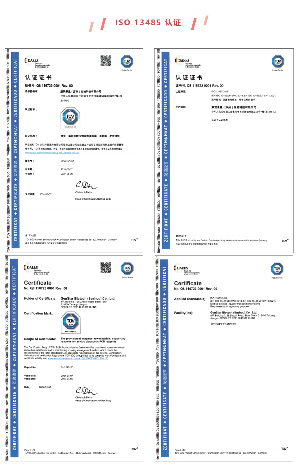 近日,康潤(rùn)景星(蘇州)生物科技有限公司(GenStar全資子公司)經(jīng)國(guó)際第三方檢測(cè)認(rèn)證機(jī)構(gòu)TÜV南德意志集團(tuán)(以下簡(jiǎn)稱“TÜV南德”)的嚴(yán)格審查,再次通過(guò)ISO9001:2015質(zhì)量管理體系ISO13485:2016醫(yī)療器械質(zhì)量管理體系認(rèn)證審核,并獲得證書。