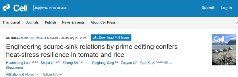 1. Huanchang Lou,Shujia Li,Zihang Shi,et al. Engineering source-sink relations by prime editing confers heat-stress resilience in tomato and rice. Cell. 2025.Jan. IF=45.6